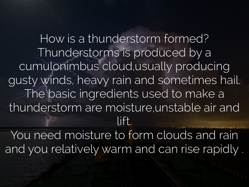 Thunderstorms is produced by a cumulonimbus cloud,usually producing gusty winds, heavy rain and sometimes hail.