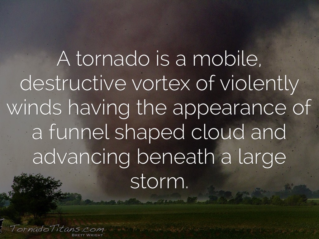 A tornado is a mobile, destructive vortex of violently winds having the appearance of a funnel shaped cloud and advancing beneath a large storm.