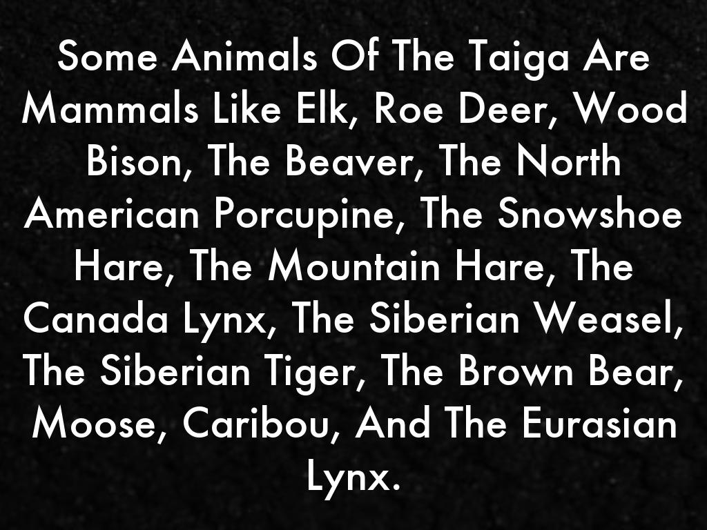 Some Animals Of The Taiga Are Mammals Like Elk, Roe Deer, Wood Bison, The Beaver, The North American Porcupine, The Snowshoe Hare, The Mountain Hare, The Canada Lynx, The Siberian Weasel, The Siberian Tiger, The Brown Bear, Moose, Caribou, And The Eurasian Lynx.