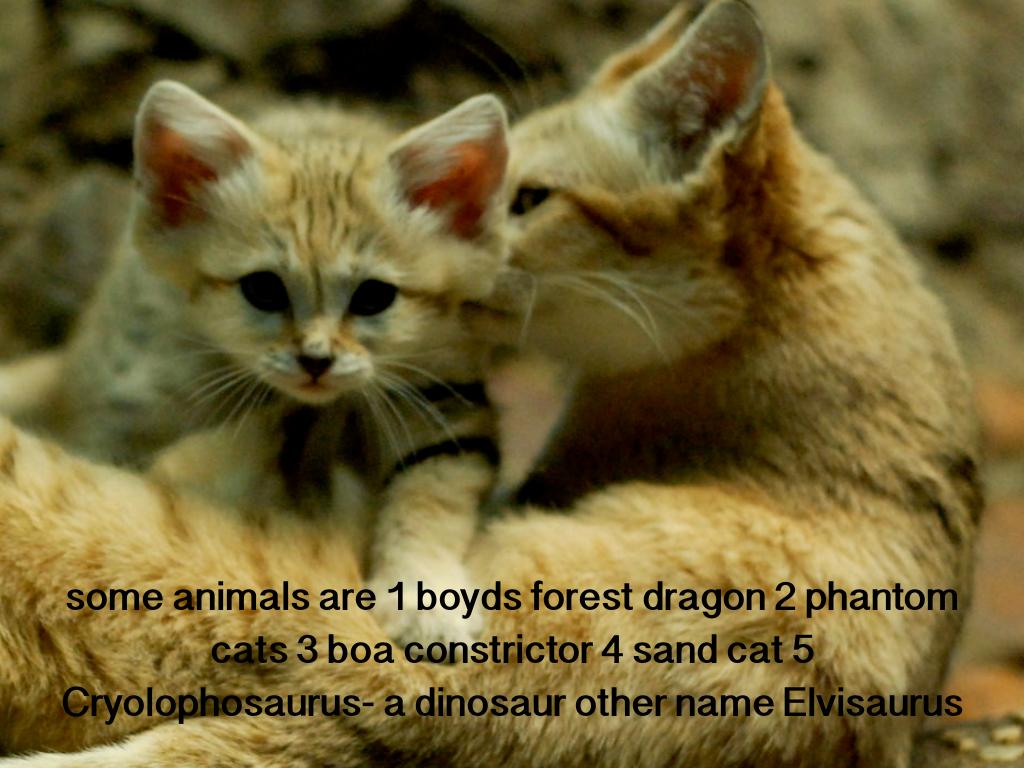 some animals are 1 boyds forest dragon 2 phantom cats 3 boa constrictor 4 sand cat 5 Cryolophosaurus- a dinosaur other name Elvisaurus