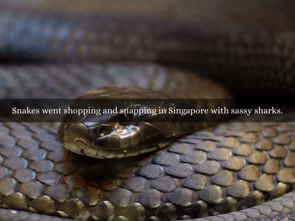 Sleepy sloths went shopping and slipping in Singapore with singing, sassy snakes.
