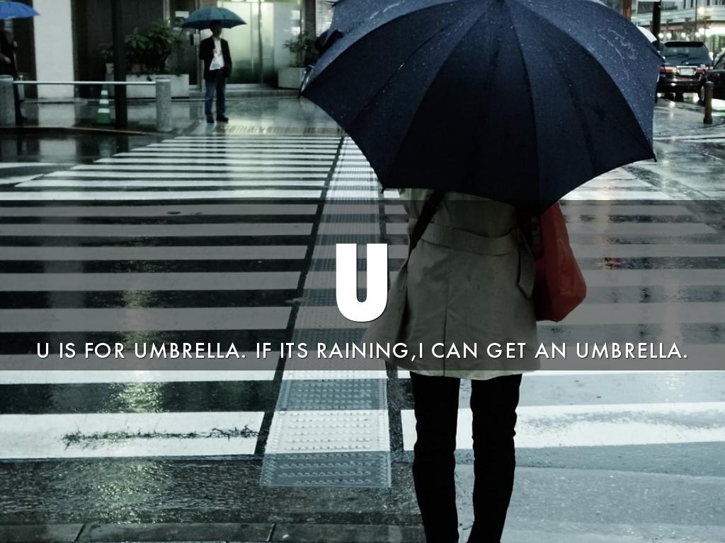 U IS FOR UMBRELLA. IF ITS RAINING,I CAN GET AN UMBRELLA.