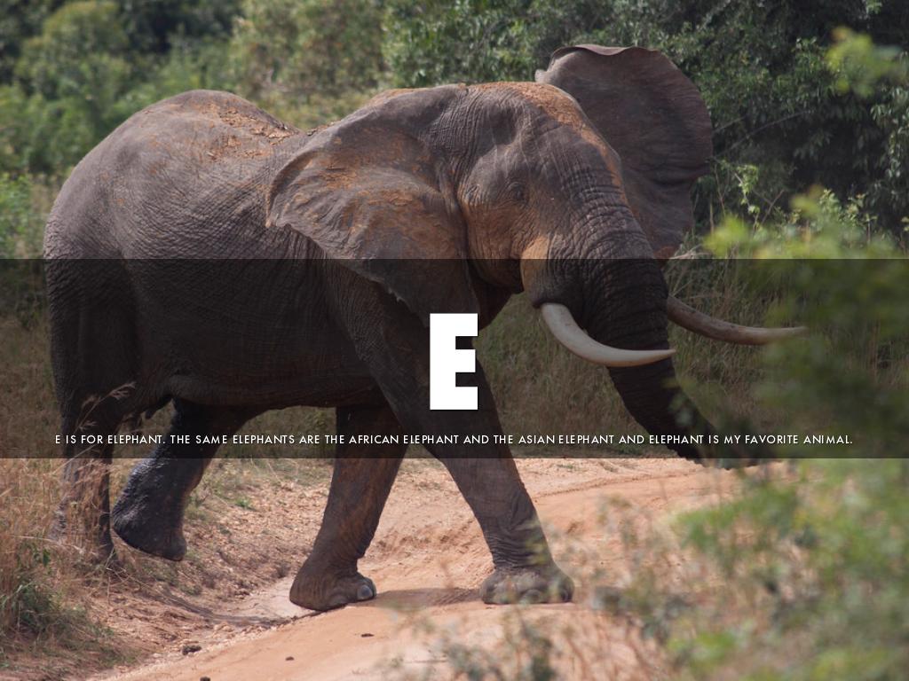E IS FOR ELEPHANT. THE SAME ELEPHANTS ARE THE AFRICAN ELEPHANT AND THE ASIAN ELEPHANT AND ELEPHANT IS MY FAVORITE ANIMAL.