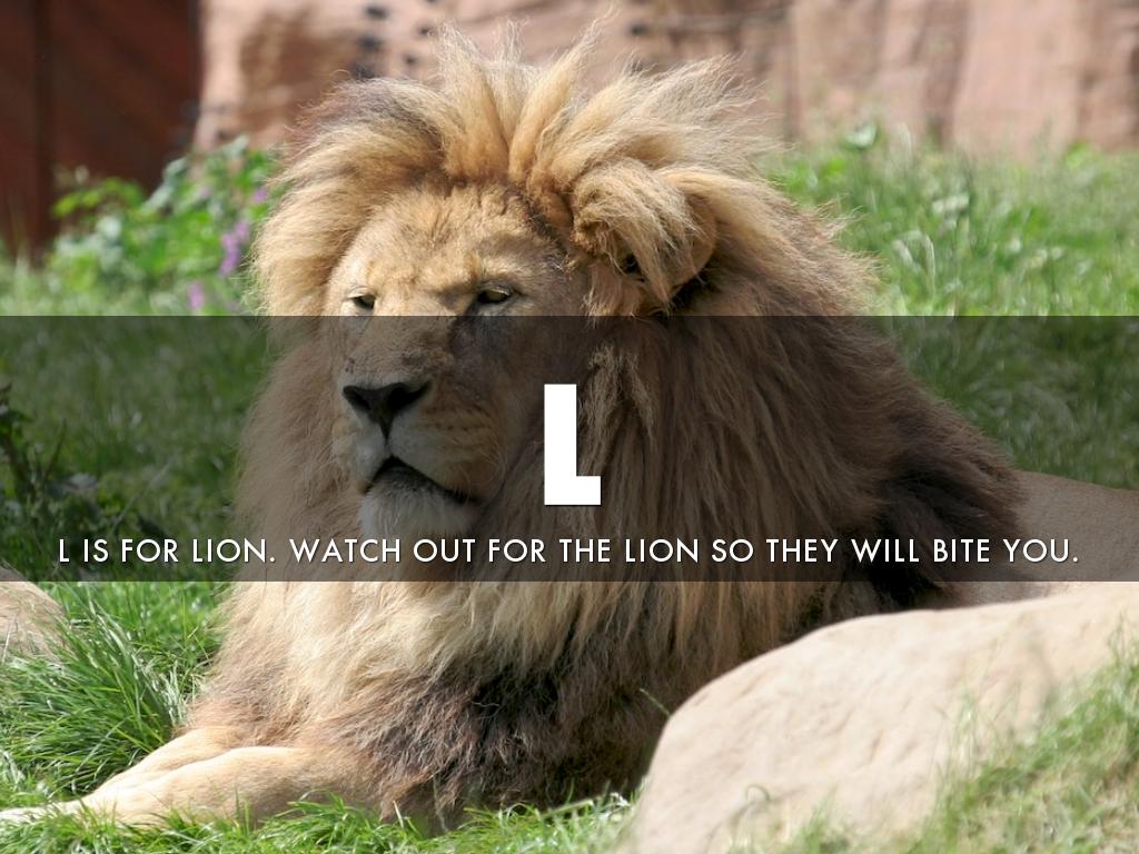L IS FOR LION. WATCH OUT FOR THE LION SO THEY WILL BITE YOU.
