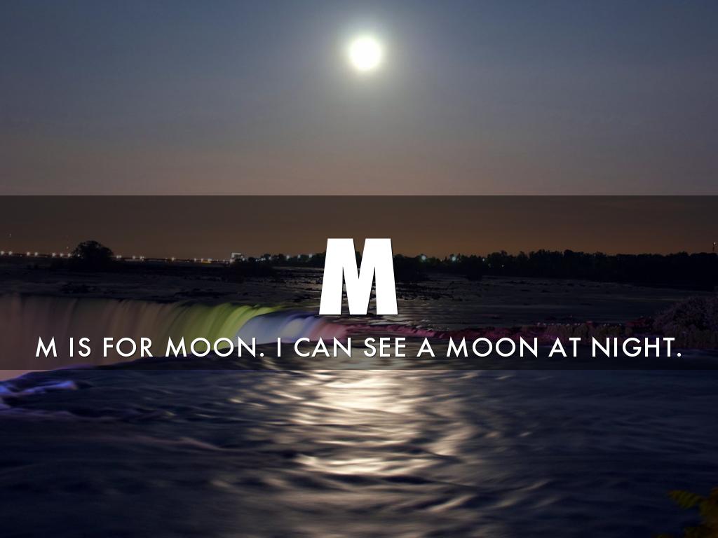 M IS FOR MOON. I CAN SEE A MOON AT NIGHT.
