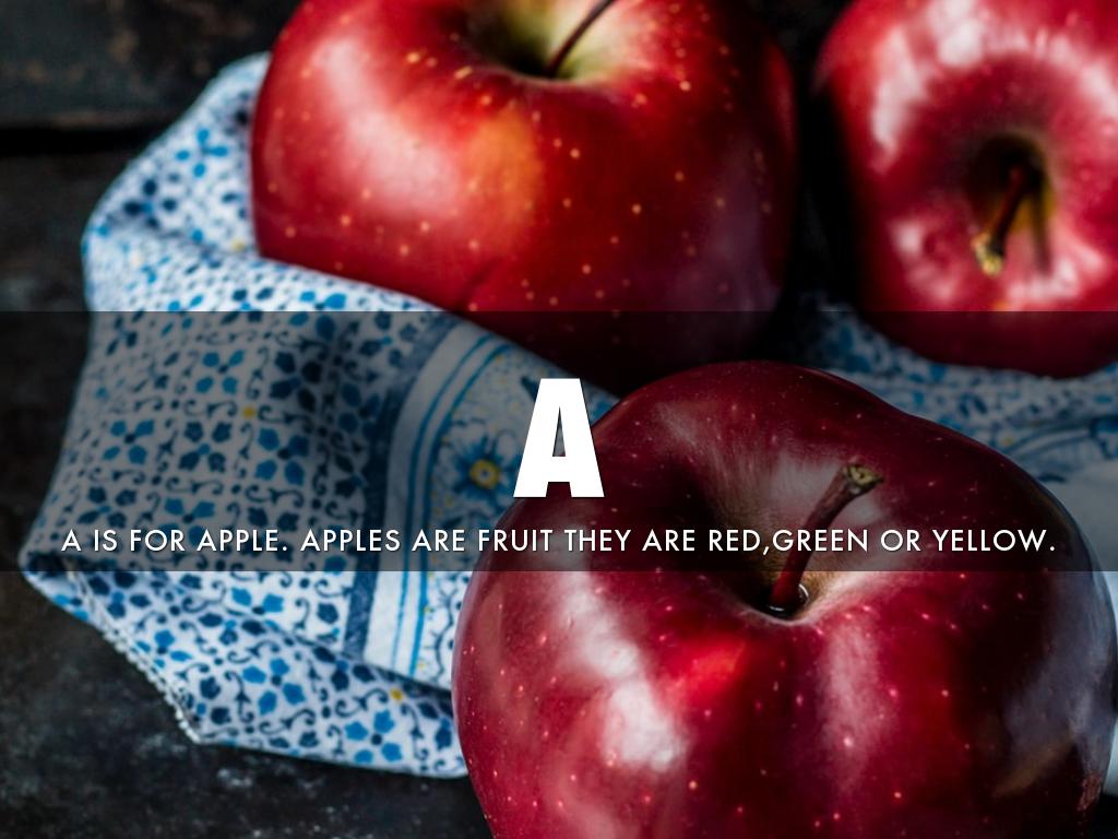 A IS FOR APPLE. APPLES ARE FRUIT THEY ARE RED,GREEN OR YELLOW.