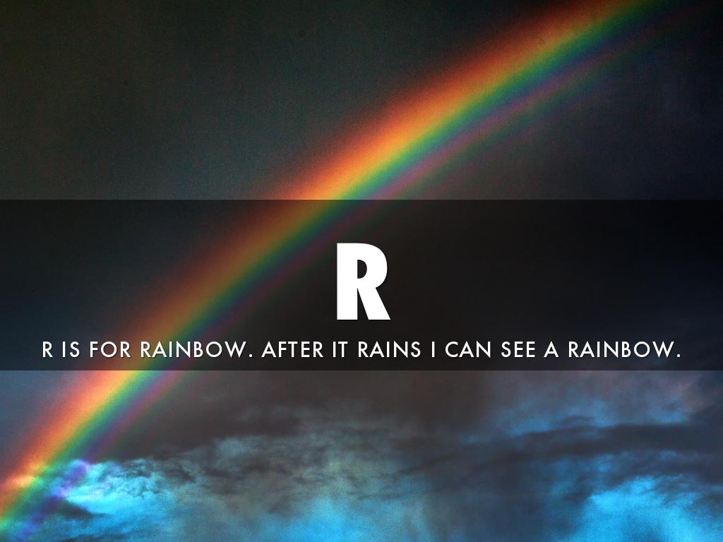 R IS FOR RAINBOW. AFTER IT RAINS I CAN SEE A RAINBOW.