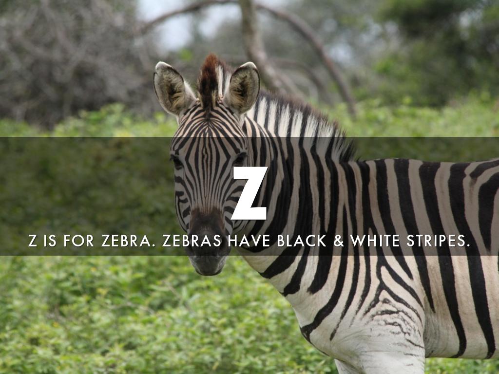 Z IS FOR ZEBRA. ZEBRAS HAVE BLACK & WHITE STRIPES.