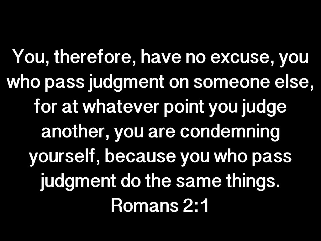 You, therefore, have no excuse, you who pass judgment on someone else, for at whatever point you judge another, you are condemning yourself, because you who pass judgment do the same things.