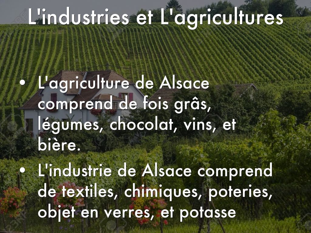 L'agriculture de Alsace comprend de fois grâs, légumes, chocolat, vins, et bière.