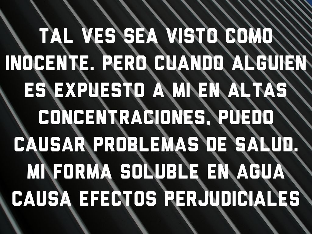 Tal ves sea visto como inocente. pero cuando alguien es expuesto a mi en altas concentraciones, puedo causar problemas de salud. mi forma soluble en agua causa efectos perjudiciales