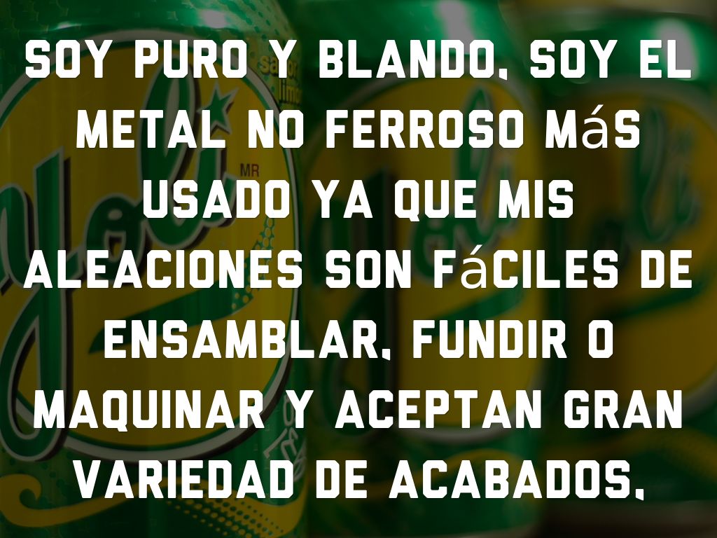 Soy puro y blando, soy el metal no ferroso más usado ya que mis aleaciones son fáciles de ensamblar, fundir o maquinar y aceptan gran variedad de acabados,