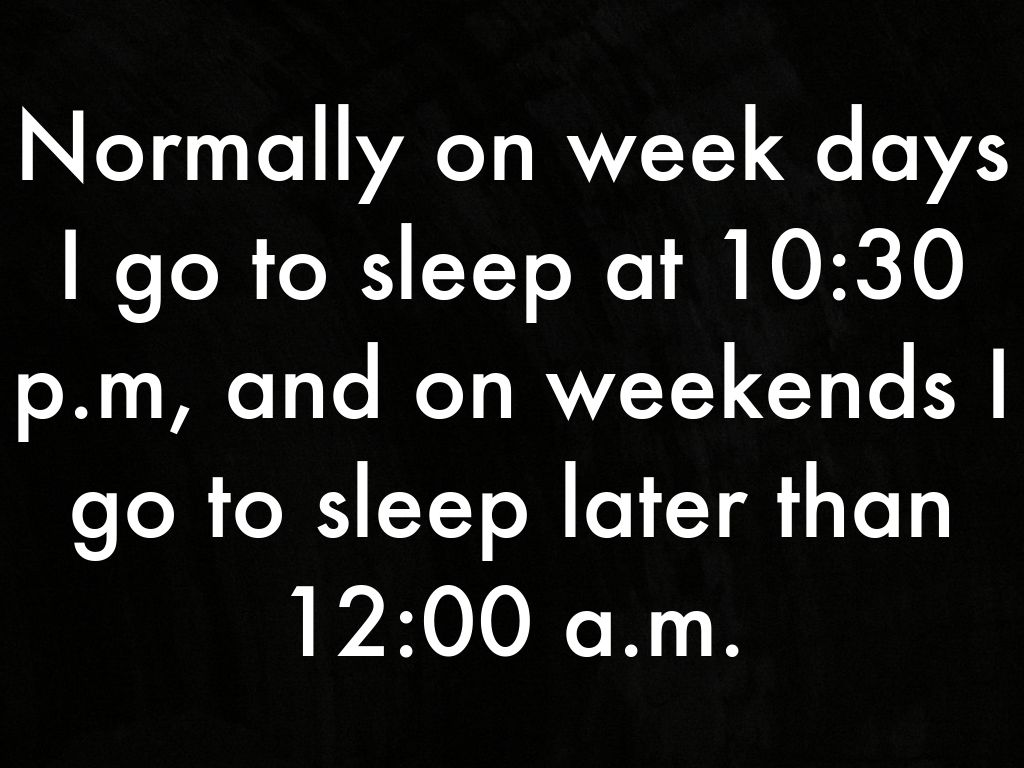 Normally on week days I go to sleep at 10:30 p.m, and on weekends I go to sleep later than 12:00 a.m.