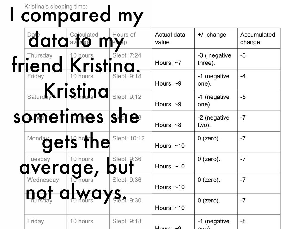 I compared my data to my friend Kristina. Kristina sometimes she gets the average, but not always.