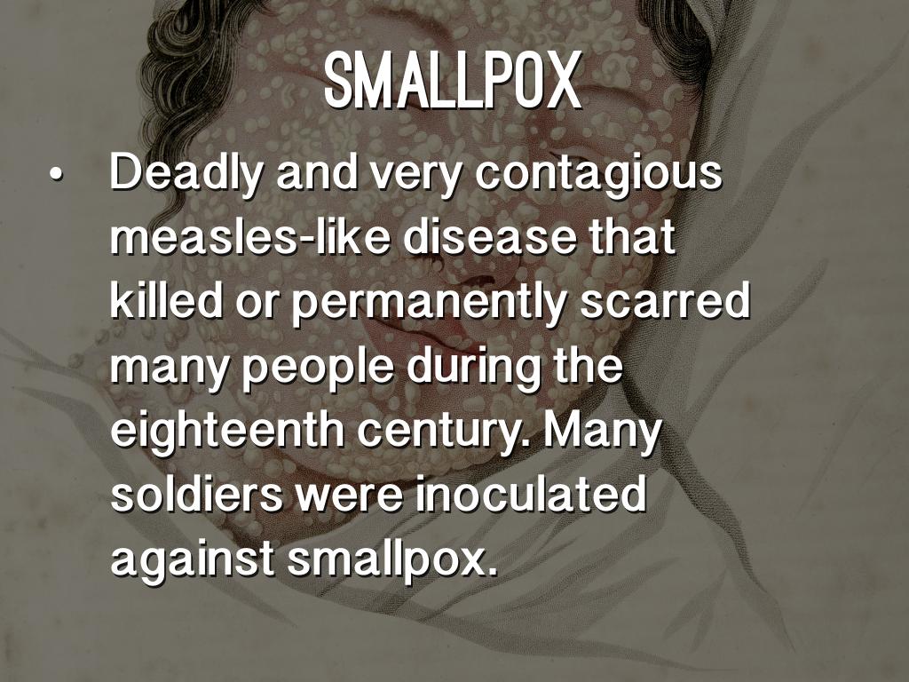 Deadly and very contagious measles-like disease that killed or permanently scarred many people during the eighteenth century. Many soldiers were inoculated against smallpox.