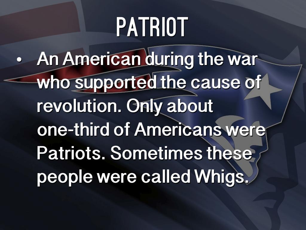 An American during the war who supported the cause of revolution. Only about one-third of Americans were Patriots. Sometimes these people were called Whigs.