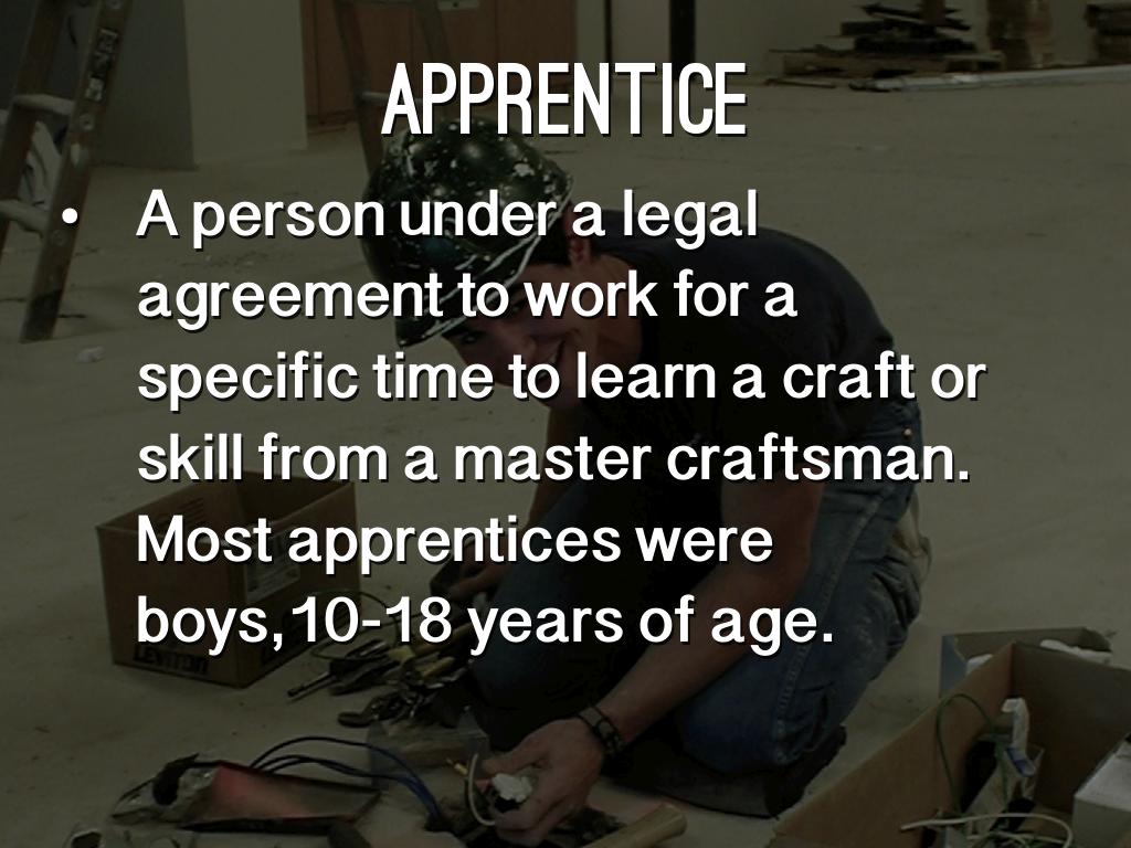 A person under a legal agreement to work for a specific time to learn a craft or skill from a master craftsman. Most apprentices were boys,10-18 years of age.