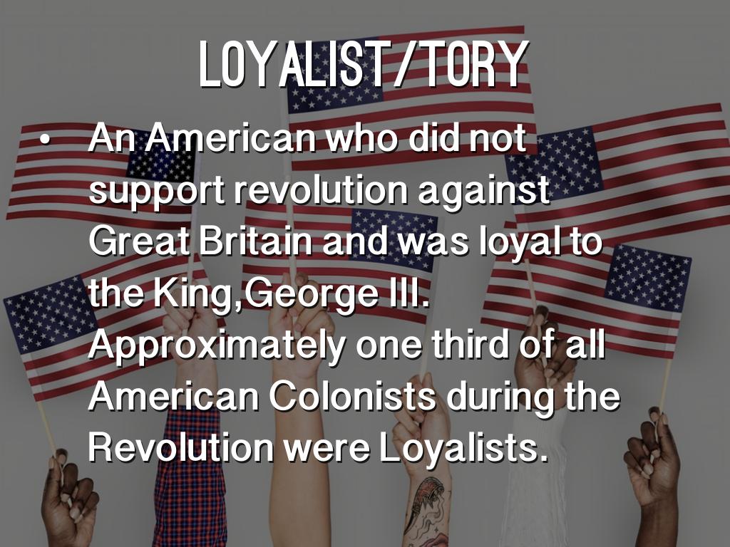 An American who did not support revolution against Great Britain and was loyal to the King,George III. Approximately one third of all American Colonists during the Revolution were Loyalists.