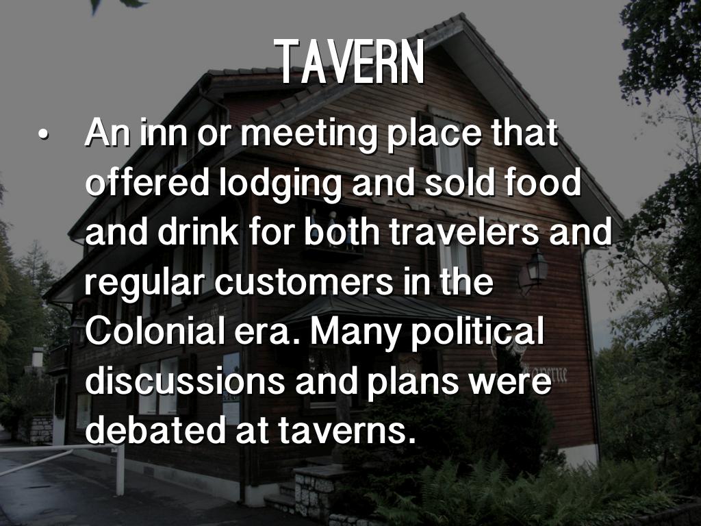 An inn or meeting place that offered lodging and sold food and drink for both travelers and regular customers in the Colonial era. Many political discussions and plans were debated at taverns.