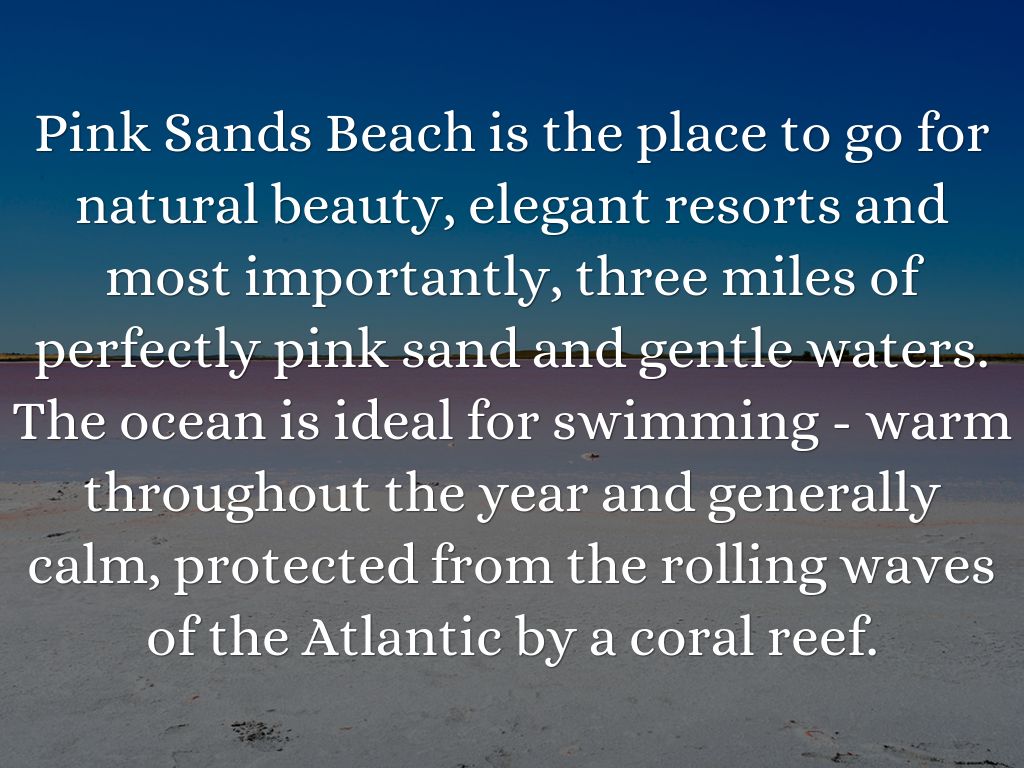 Pink Sands Beach is the place to go for natural beauty, elegant resorts and most importantly, three miles of perfectly pink sand and gentle waters. The ocean is ideal for swimming - warm throughout the year and generally calm, protected from the rolling waves of the Atlantic by a coral reef.