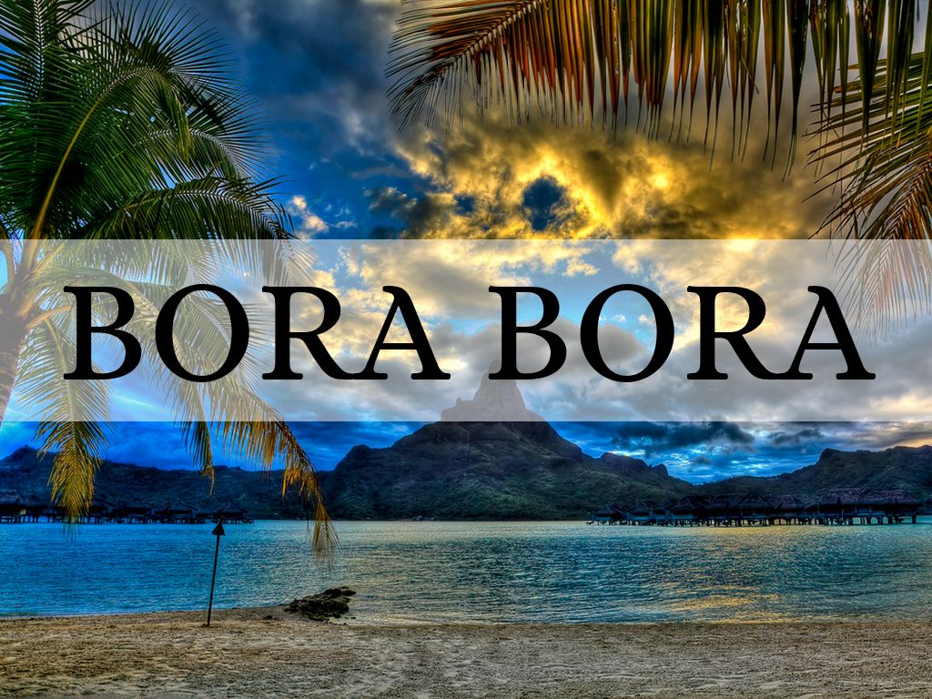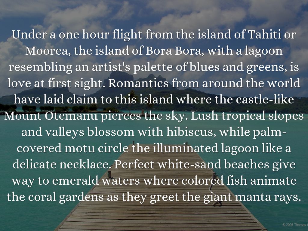 Under a one hour flight from the island of Tahiti or Moorea, the island of Bora Bora, with a lagoon resembling an artist's palette of blues and greens, is love at first sight. Romantics from around the world have laid claim to this island where the castle-like Mount Otemanu pierces the sky. Lush tropical slopes and valleys blossom with hibiscus, while palm-covered motu circle the illuminated lagoon like a delicate necklace. Perfect white-sand beaches give way to emerald waters where colored fish animate the coral gardens as they greet the giant manta rays.