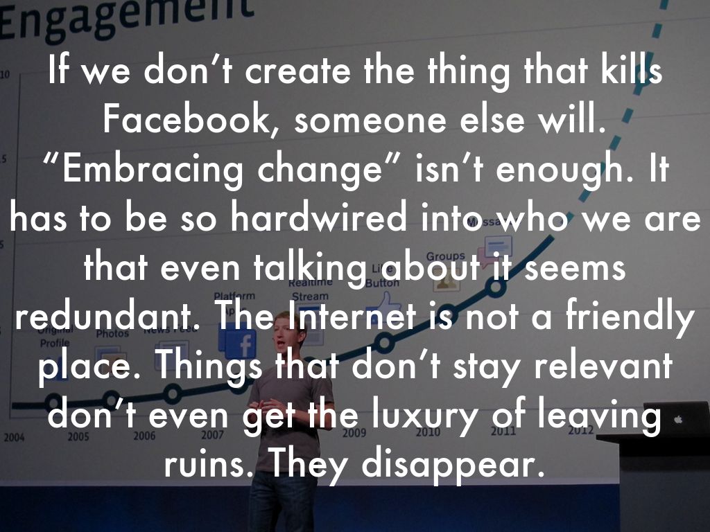 If we don’t create the thing that kills Facebook, someone else will. “Embracing change” isn’t enough. It has to be so hardwired into who we are that even talking about it seems redundant. The Internet is not a friendly place. Things that don’t stay relevant don’t even get the luxury of leaving ruins. They disappear.