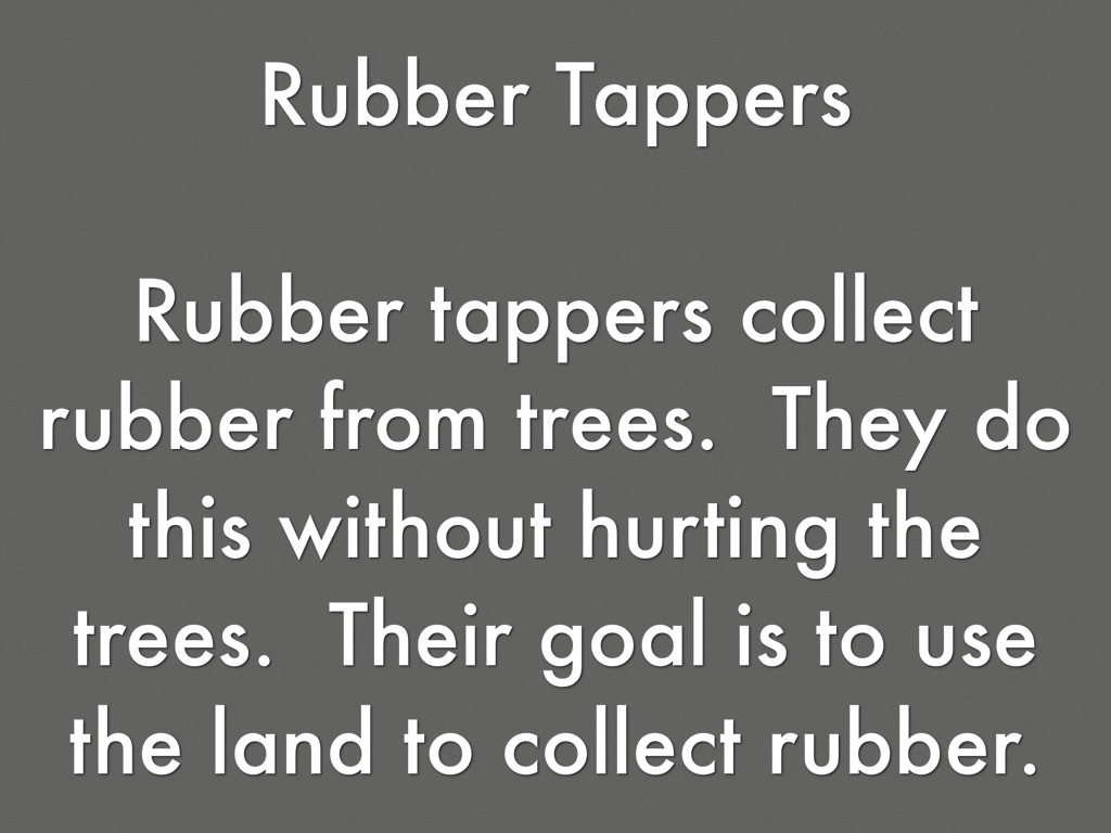 Rubber tappers collect rubber from trees. They do this without hurting the trees. Their goal is to use the land to collect rubber.