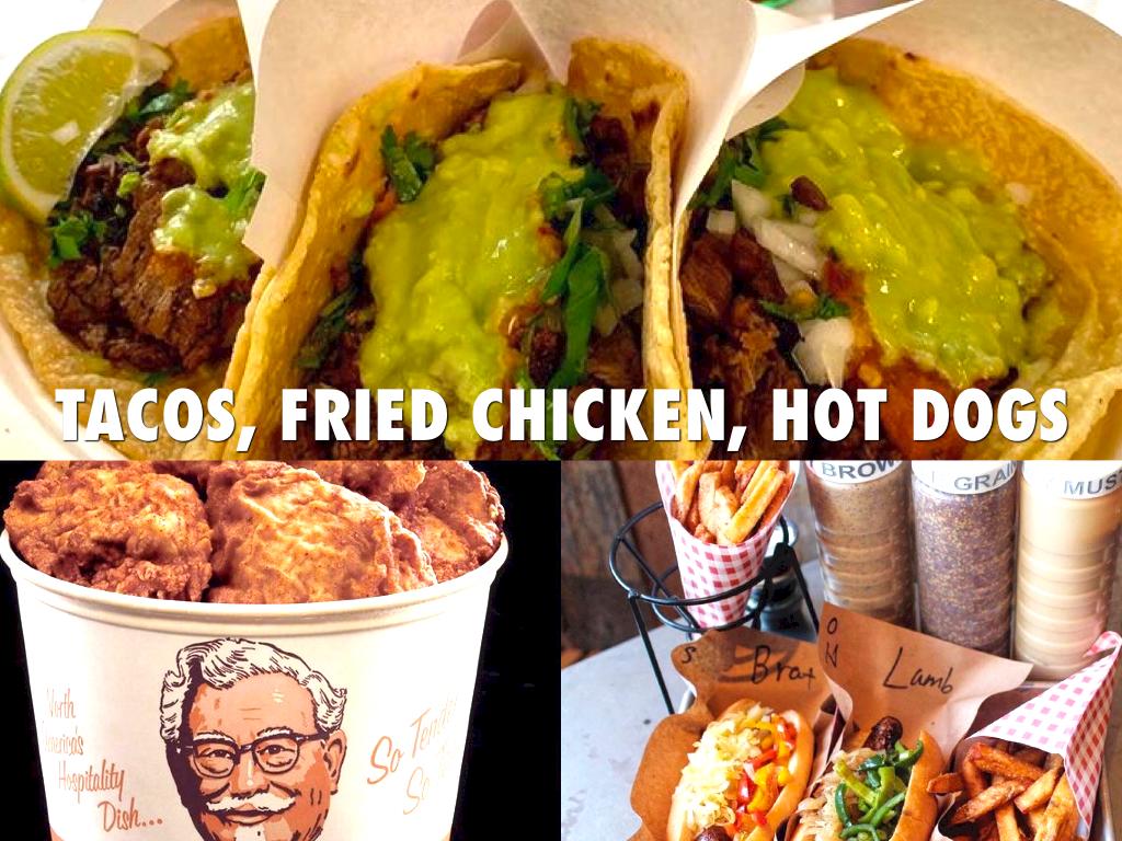 TACOS, FRIED CHICKEN, HOT DOGS