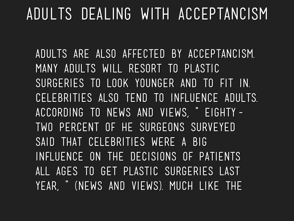 Adults are also affected by acceptancism. Many adults will resort to plastic surgeries to look younger and to fit in. Celebrities also tend to influence adults. According to News and Views, " Eighty- two percent of he surgeons surveyed said that celebrities were a big influence on the decisions of patients all ages to get plastic surgeries last year, " (News and Views). Much like the poem "I Sit and Look Out" by Walt Whitman, people feel shame and jealousy when they see celebrities and they want to change their appearance to be accepted by society.