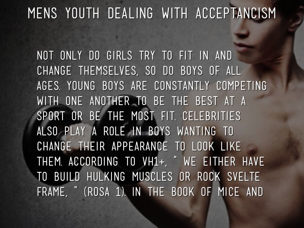 Not only do girls try to fit in and change themselves, so do boys of all ages. Young boys are constantly competing with one another to be the best at a sport or be the most fit. Celebrities also play a role in boys wanting to change their appearance to look like them. According to VH1+, " we either have to build hulking muscles or rock svelte frame, " (Rosa 1). In the book Of Mice And Men, Curley was shorter than most and was insecure about his height, like many boys they are also insecure because society has told them being tall is better than being short.