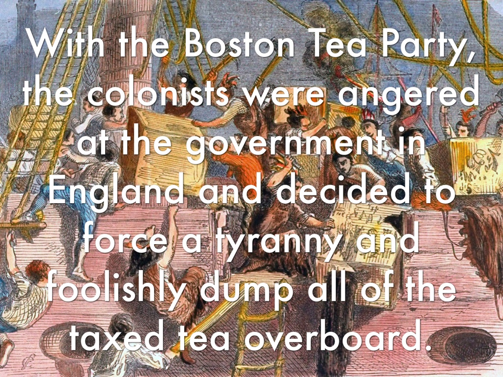 With the Boston Tea Party, the colonists were angered at the government in England and decided to force a tyranny and foolishly dump all of the taxed tea overboard.