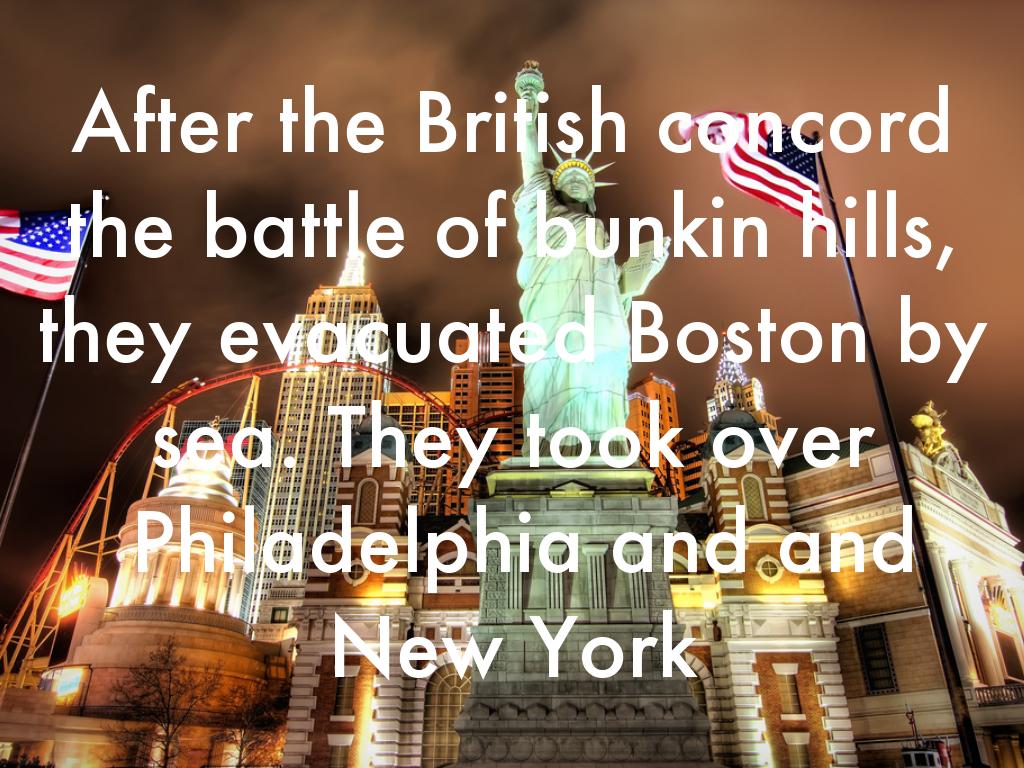 After the British concord the battle of bunkin hills, they evacuated Boston by sea. They took over Philadelphia and and New York