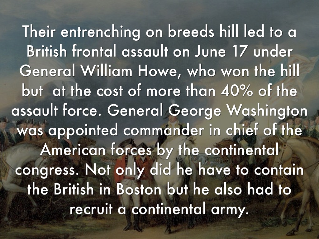 Their entrenching on breeds hill led to a British frontal assault on June 17 under General William Howe, who won the hill but at the cost of more than 40% of the assault force. General George Washington was appointed commander in chief of the American forces by the continental congress. Not only did he have to contain the British in Boston but he also had to recruit a continental army.
