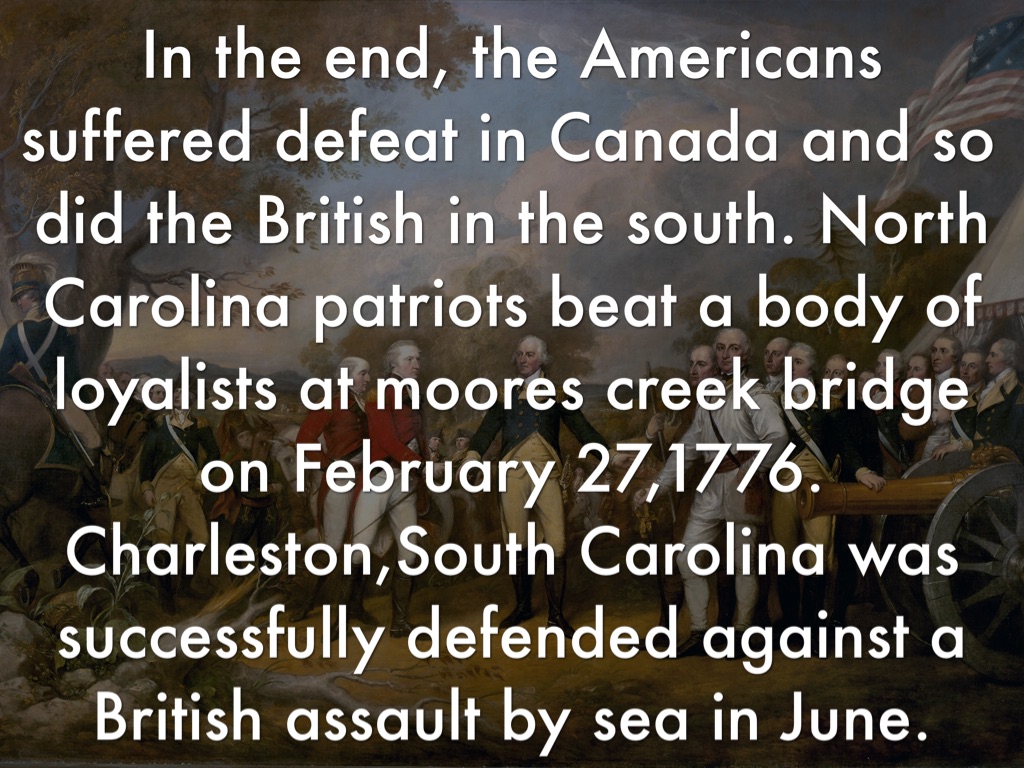 In the end, the Americans suffered defeat in Canada and so did the British in the south. North Carolina patriots beat a body of loyalists at moores creek bridge on February 27,1776. Charleston,South Carolina was successfully defended against a British assault by sea in June.