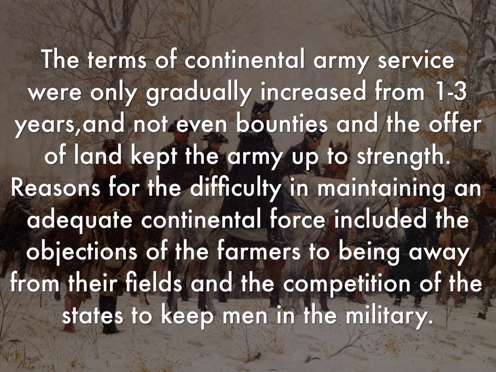 The terms of continental army service were only gradually increased from 1-3 years,and not even bounties and the offer of land kept the army up to strength. Reasons for the difficulty in maintaining an adequate continental force included the objections of the farmers to being away from their fields and the competition of the states to keep men in the military.