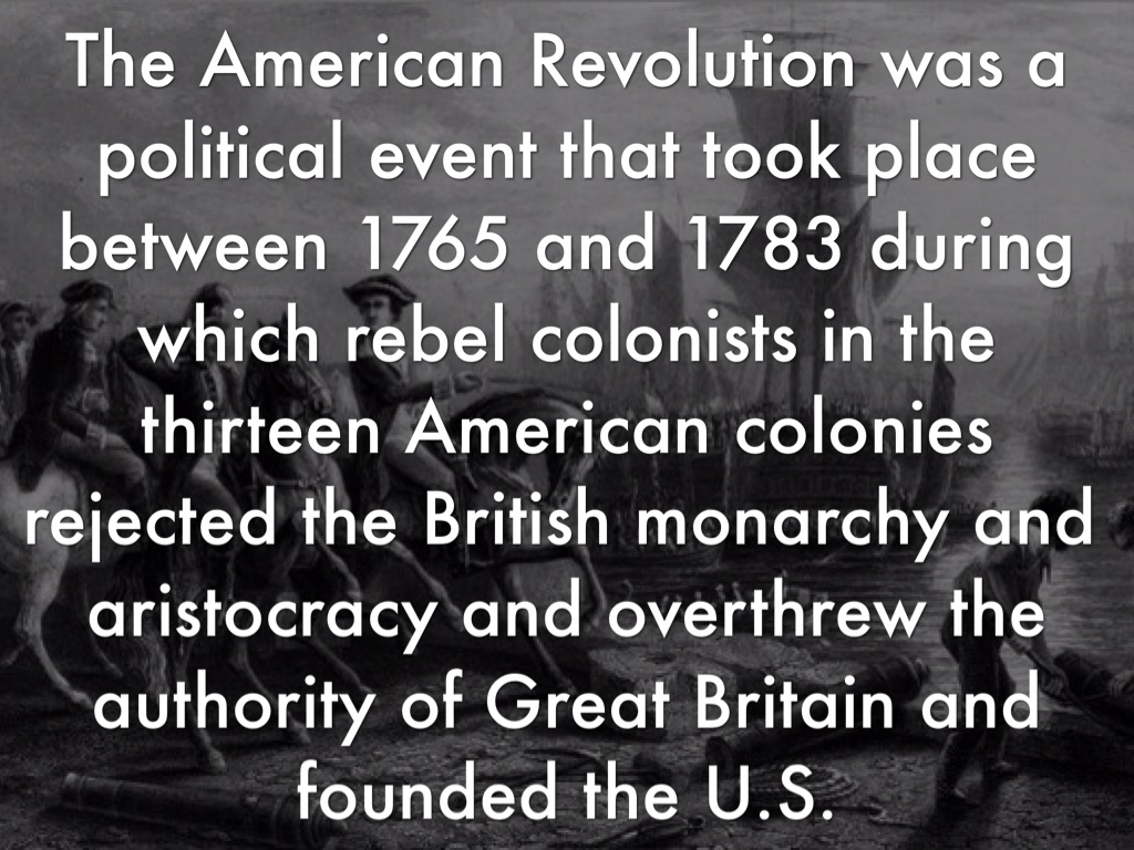 The American Revolution was a political event that took place between 1765 and 1783 during which rebel colonists in the thirteen American colonies rejected the British monarchy and aristocracy and overthrew the authority of Great Britain and founded the U.S.