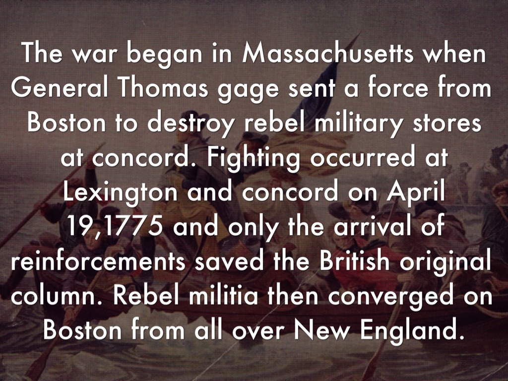 The war began in Massachusetts when General Thomas gage sent a force from Boston to destroy rebel military stores at concord. Fighting occurred at Lexington and concord on April 19,1775 and only the arrival of reinforcements saved the British original column. Rebel militia then converged on Boston from all over New England.