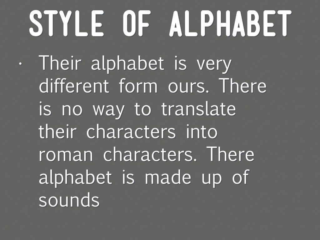 Their alphabet is very different form ours. There is no way to translate their characters into roman characters. There alphabet is made up of sounds