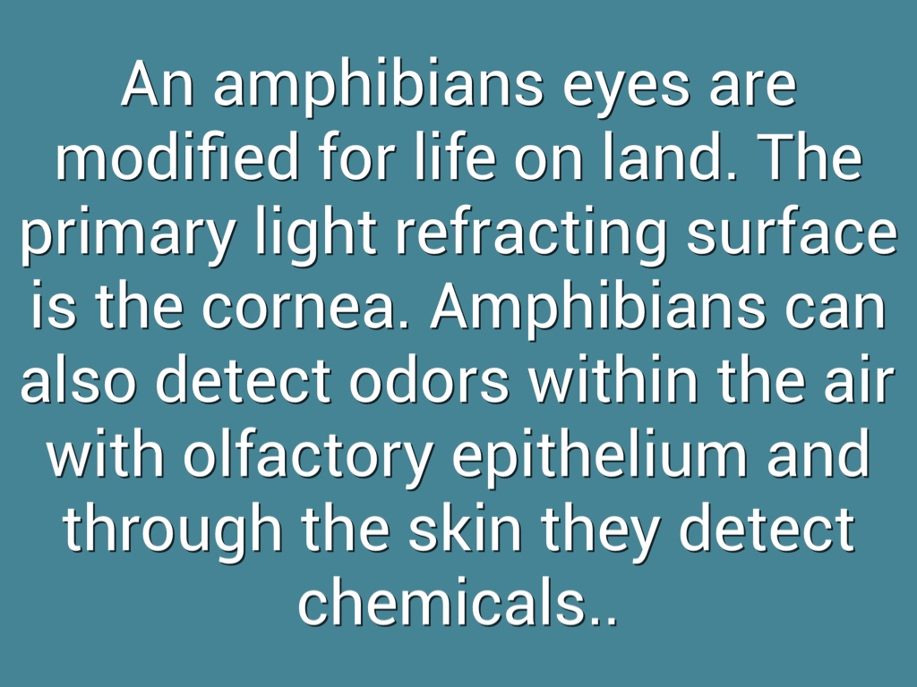 An amphibians eyes are modified for life on land. The primary light refracting surface is the cornea. Amphibians can also detect odors within the air with olfactory epithelium and through the skin they detect chemicals..