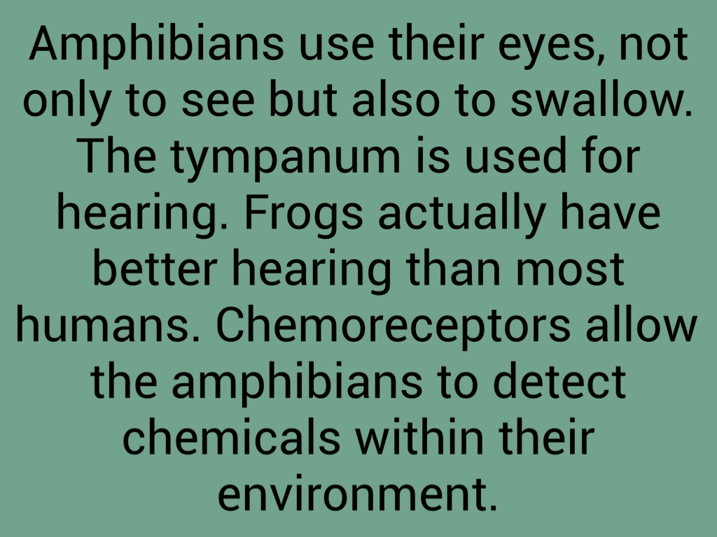 Amphibians use their eyes, not only to see but also to swallow. The tympanum is used for hearing. Frogs actually have better hearing than most humans. Chemoreceptors allow the amphibians to detect chemicals within their environment.