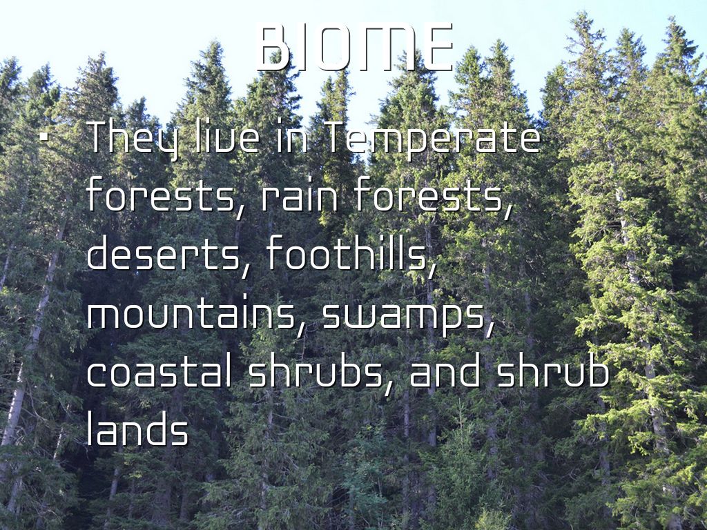 They live in Temperate forests, rain forests, deserts, foothills, mountains, swamps, coastal shrubs, and shrub lands