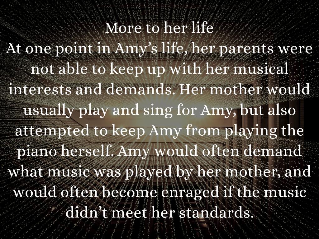 More to her life At one point in Amy’s life, her parents were not able to keep up with her musical interests and demands. Her mother would usually play and sing for Amy, but also attempted to keep Amy from playing the piano herself. Amy would often demand what music was played by her mother, and would often become enraged if the music didn’t meet her standards.
