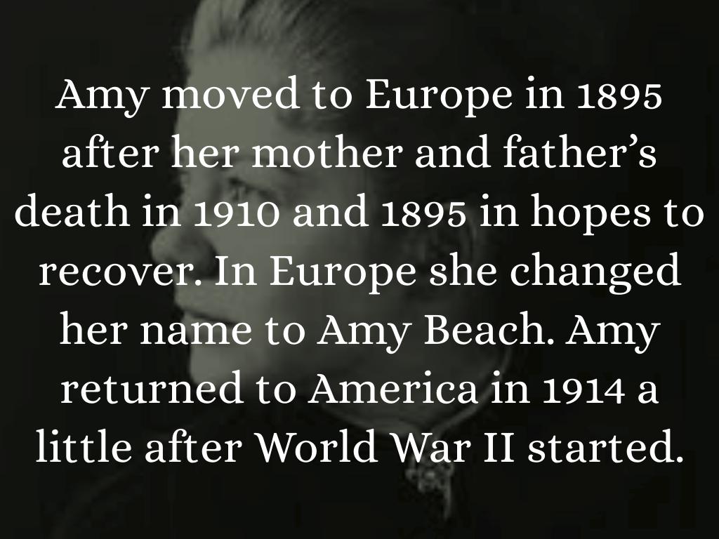 Amy moved to Europe in 1895 after her mother and father’s death in 1910 and 1895 in hopes to recover. In Europe she changed her name to Amy Beach. Amy returned to America in 1914 a little after World War II started.