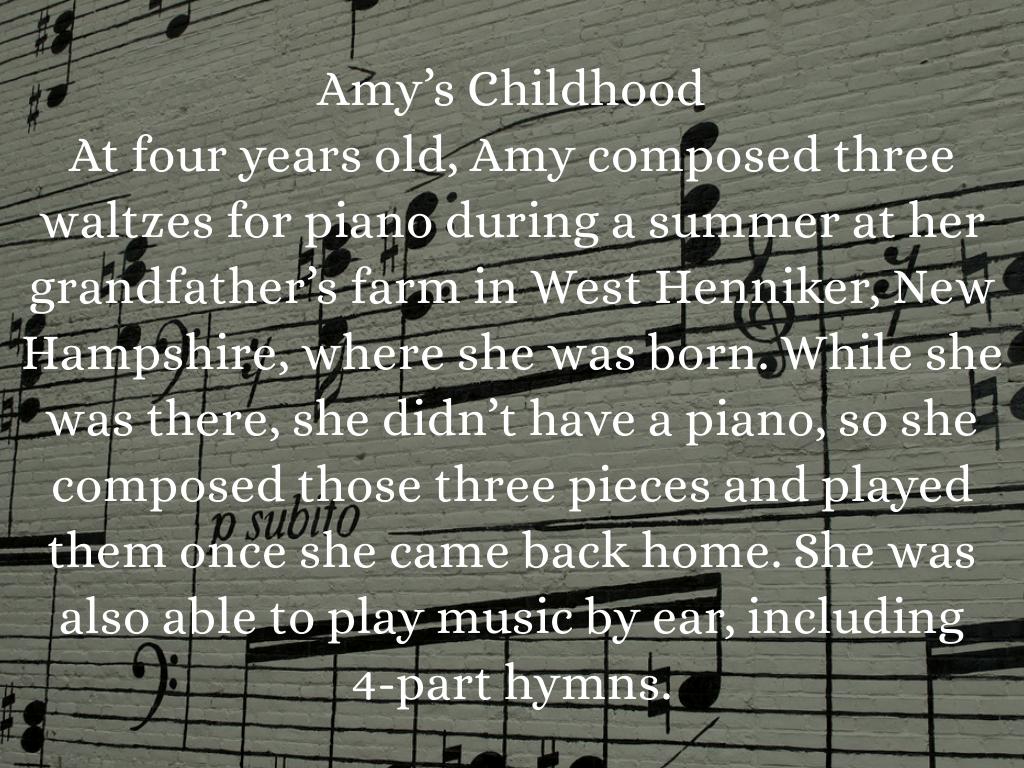 Amy’s Childhood At four years old, Amy composed three waltzes for piano during a summer at her grandfather’s farm in West Henniker, New Hampshire, where she was born. While she was there, she didn’t have a piano, so she composed those three pieces and played them once she came back home. She was also able to play music by ear, including 4-part hymns.