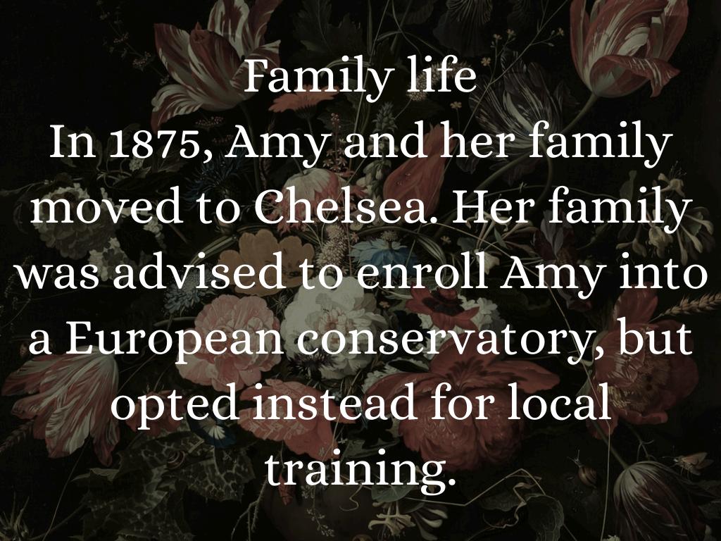 Family life In 1875, Amy and her family moved to Chelsea. Her family was advised to enroll Amy into a European conservatory, but opted instead for local training.