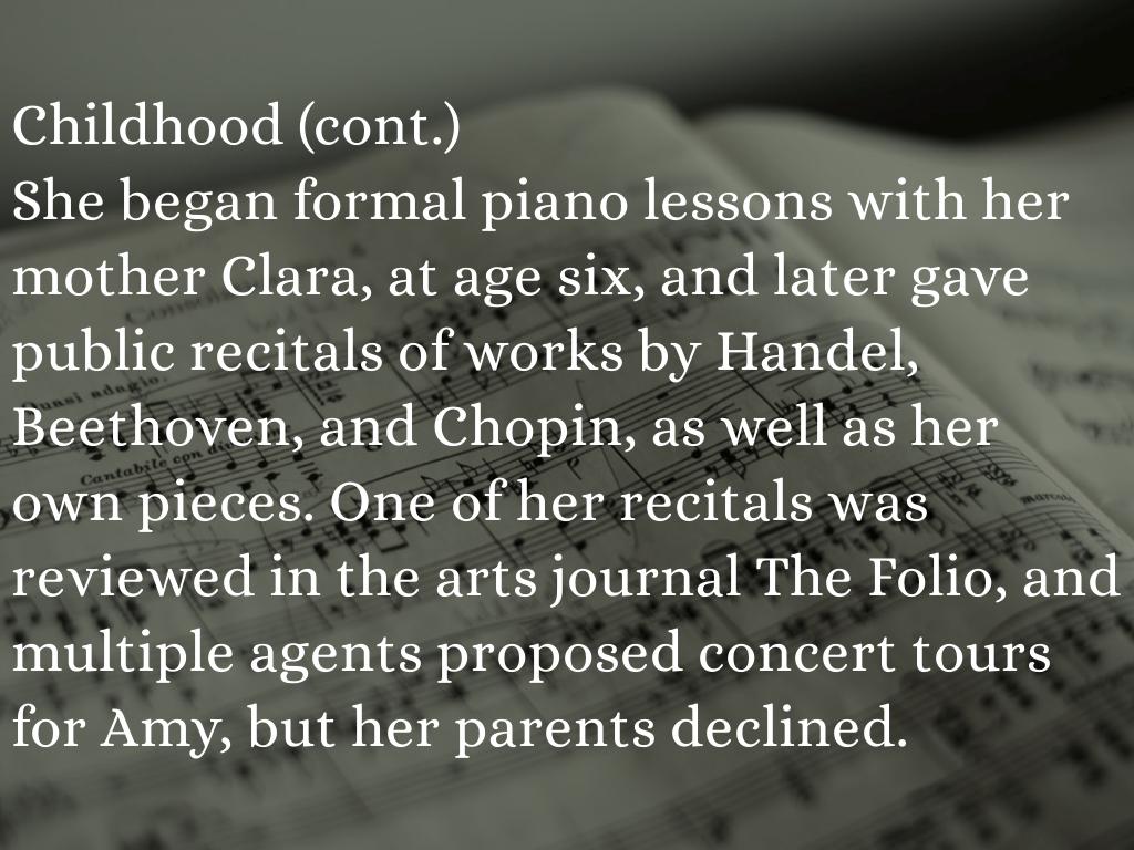 Childhood (cont.) She began formal piano lessons with her mother Clara, at age six, and later gave public recitals of works by Handel, Beethoven, and Chopin, as well as her own pieces. One of her recitals was reviewed in the arts journal The Folio, and multiple agents proposed concert tours for Amy, but her parents declined.