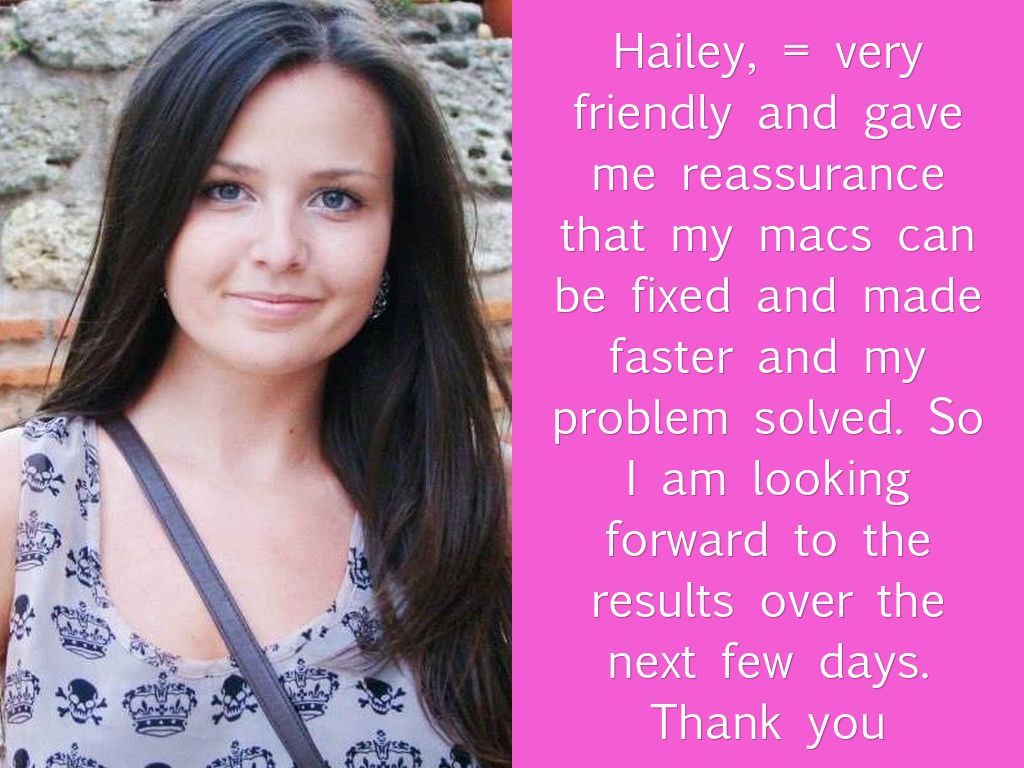 Hailey, = very friendly and gave me reassurance that my macs can be fixed and made faster and my problem solved. So I am looking forward to the results over the next few days. Thank you