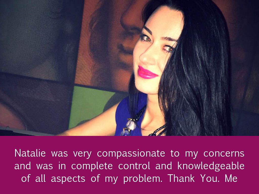 Natalie was very compassionate to my concerns and was in complete control and knowledgeable of all aspects of my problem. Thank You. Me