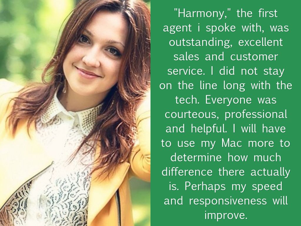 "Harmony," the first agent i spoke with, was outstanding, excellent sales and customer service. I did not stay on the line long with the tech. Everyone was courteous, professional and helpful. I will have to use my Mac more to determine how much difference there actually is. Perhaps my speed and responsiveness will improve.