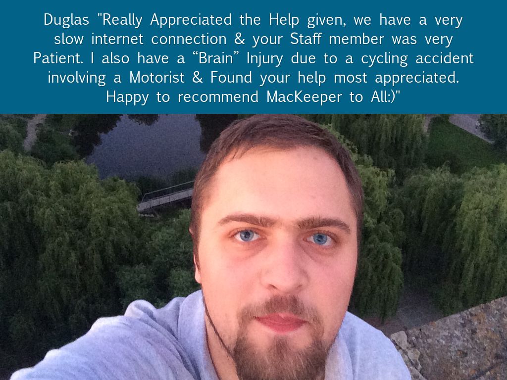 Duglas "Really Appreciated the Help given, we have a very slow internet connection & your Staff member was very Patient. I also have a “Brain” Injury due to a cycling accident involving a Motorist & Found your help most appreciated. Happy to recommend MacKeeper to All:)"